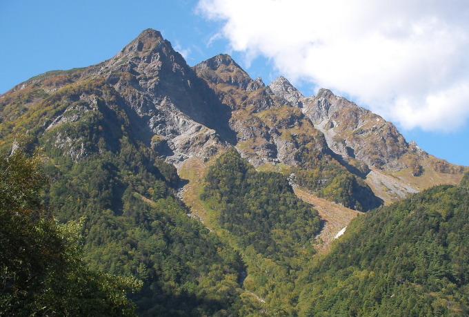 徳本峠を下り、登山道分岐に戻り、明神岳を見上げた。