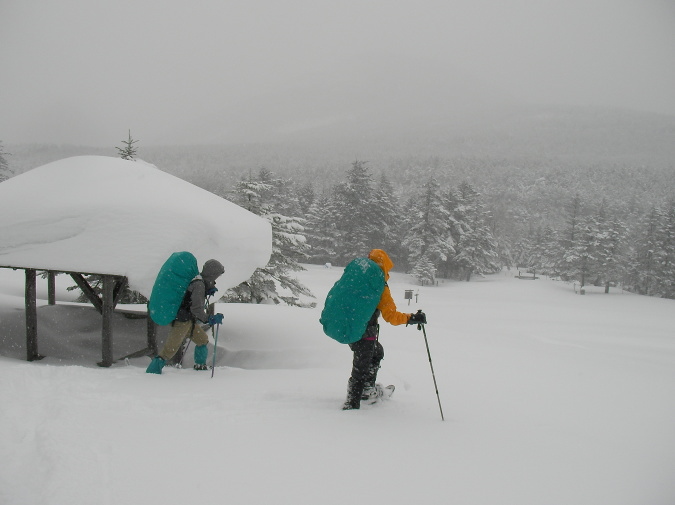 東屋は雪に埋もれていた。スノースコップはあるが、休憩するために疲れるのでパスする。